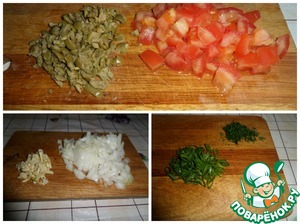 • Нарезаем помидоры - кубиком, лук - мелким кубиком, оливки - произвольно (я нарезала помельче). Мелко нарезаем зелень и чеснок.