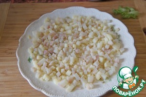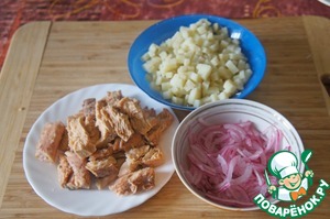 Картофель нарезать крошечными кубиками. Рыбу очистить от косточек и кожи и разобрать на кусочки. Несколько длинных кусочков оставить для украшения, остальные разделить на кубики.