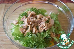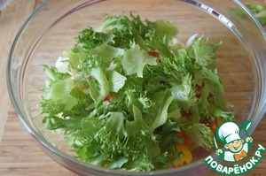 Листья салата нарвать руками на кусочки и добавить в миску. -