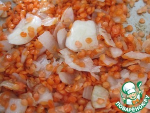 Жарить, помешивая, около 1 минуты. Влить воду или бульон. Довести до кипения и варить до готовности чечевицы - минут 15 или в скороварке - 5 минут.