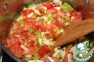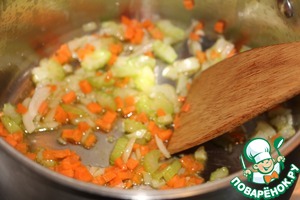 В кастрюле с толстым дном обжарить на оливковом масле мелконарезанный чеснок, лук, сельдерей и морковь.