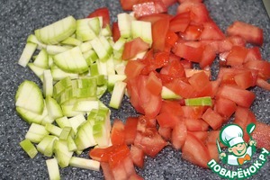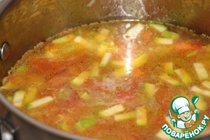 Пока обжариваются овощи порезать кубиками кабачок (или цукини) и помидор.