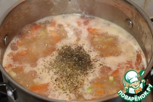 Приправить суп сухим базиликом и орегано, посолить и поперчить по вкусу, довести до кипения.