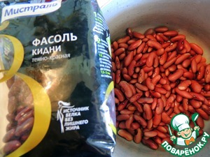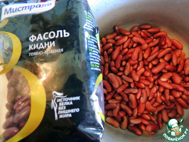 Фасоль замачиваем на 4 часа в воде, затем меняем воду и варим почти до готовности.