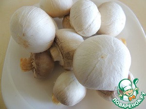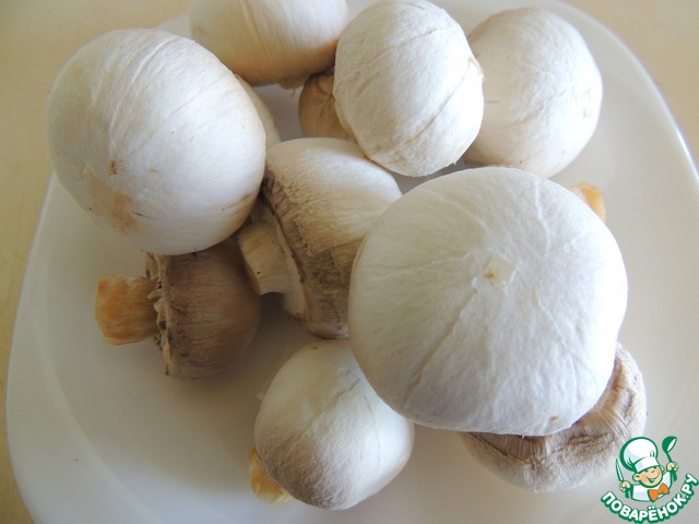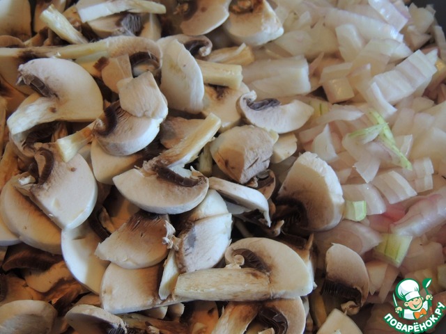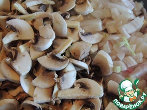Грибы нарезаем небольшими пластинами, лук мелко режем. Обжариваем на сковородке с маслом.
