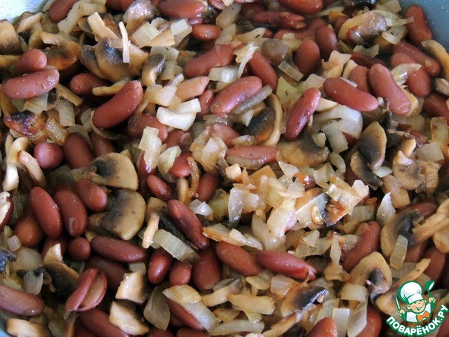 К грибам добавляем фасоль, перемешиваем и ещё 5 минут обжариваем под крышкой.