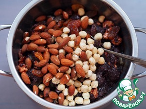 Добавить орехи, цукаты и изюм (подбор орехов и цукатов - на ваш вкус, желание и наличие). Миндаль и фундук предварительно подсушить в микроволновой печи 1,5 минуты на полной мощности (или на сухой сковороде до появления орехового аромата).