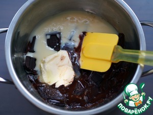 Шоколад разломать на кусочки и поместить на водяную баню, добавив к нему масло, сгущенное молоко и коньяк. Если готовите для детей то коньяк добавлять не нужно, он здесь для усиления вкуса и аромата, но не обязательный ингредиент.