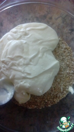 К обжаренным и остывшим овсяным хлопьям добавляем сливочное масло, взбитое с желтками и сахаром и хорошенько перемешиваем
