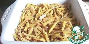 • Почистить картофель и нарезать соломкой, добавить специи, масло, выложить на противень.
