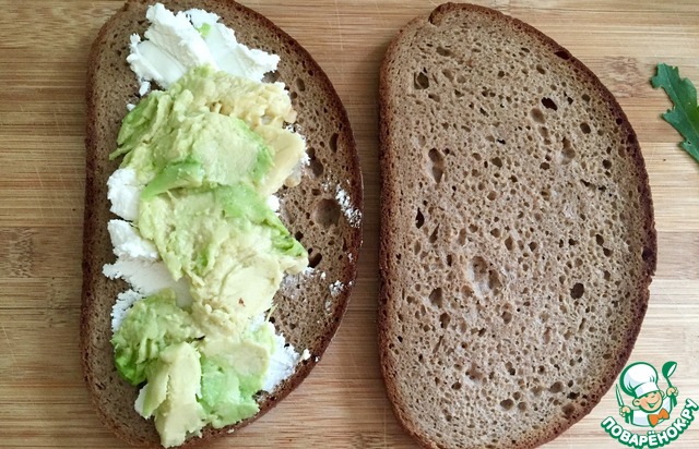 Возьмите 2 ломтика вашего любимого хлеба. На один кусочек намажьте козий сыр, сверху положите тонко нарезанный авокадо и сверху насыпьте руккола.