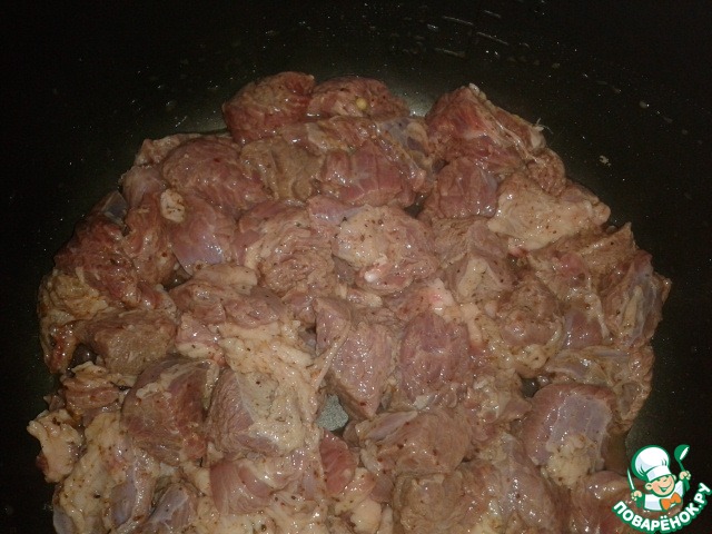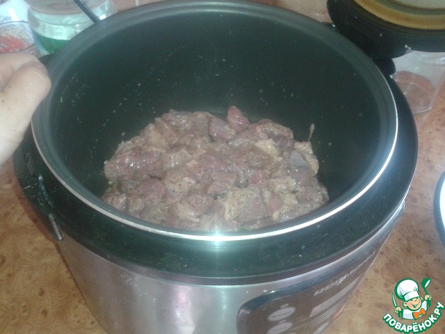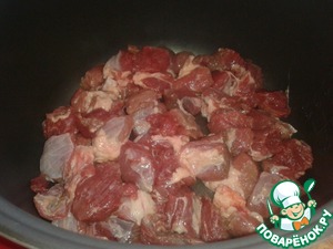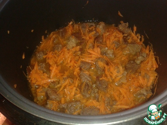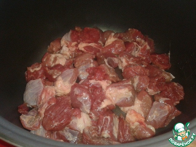 Добавляем растительное масло и ставим на программу "Жарка" на 1,5 часа. Многие могут сказать, что это слишком много. Не волнуйтесь, мясо не пригорит. Просто вначале мы обжариваем слегка мясо, а потом, добавив воды, оно тушиться. Предупреждаю сразу, что воды нужно прибавлять несколько раз.