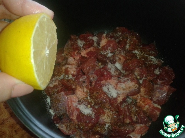 Добавляем соль, перец белый горошком (5 шт) и приправу для шашлыка (мне она очень нравится, т. к. она придает более насыщенный запах и вкус мясу). После добавляем сок половины лимона.