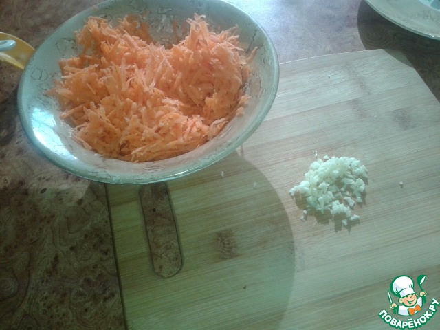 Пока наше мясо готовится, мы приступаем к подготовке морковки и чеснока. Морковь я взяла одну, так как она у меня была достаточно большая. Натираем ее на крупной терке. Чеснок измельчаем ножом (меленько-меленько).