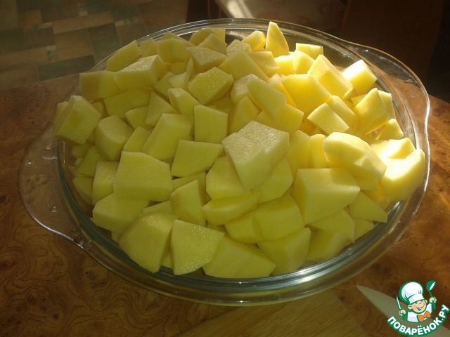 Также чистим картофель и нарезаем его на средние кусочки. Вообще можно нарезать как угодно, это зависит от Ваших личных вкусов и предпочтений)