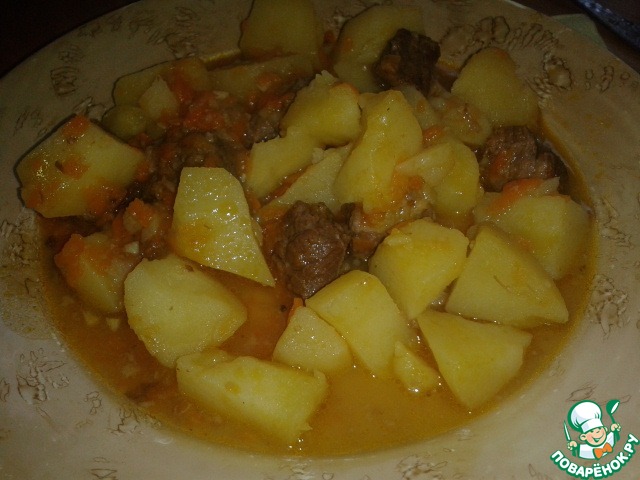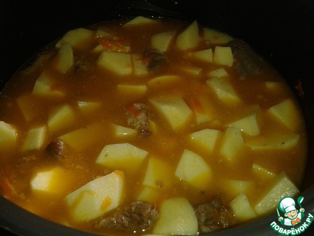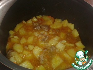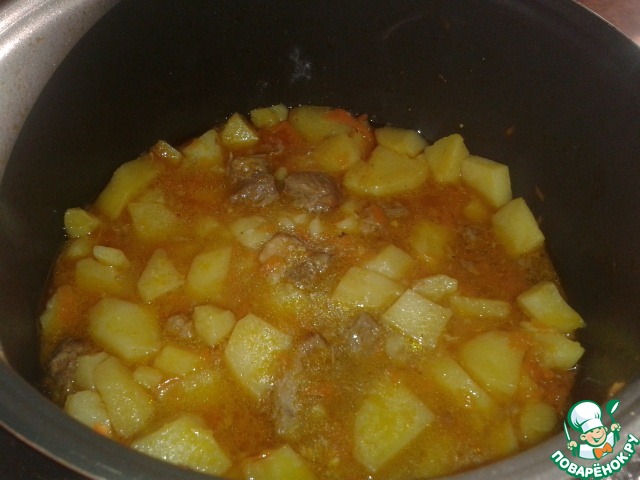 Когда мясо обжариться с морковью и чесноком добавляем туда наш нарезанный картофель и добавляем воды, чтобы она закрывала картофель. Я еще дополнительно подсолила, т. к. для картофеля будет недостаточно соли, которую я добавляла еще в самом начале. И теперь переставляем нашу программу на "Тушение" на 40 минут.