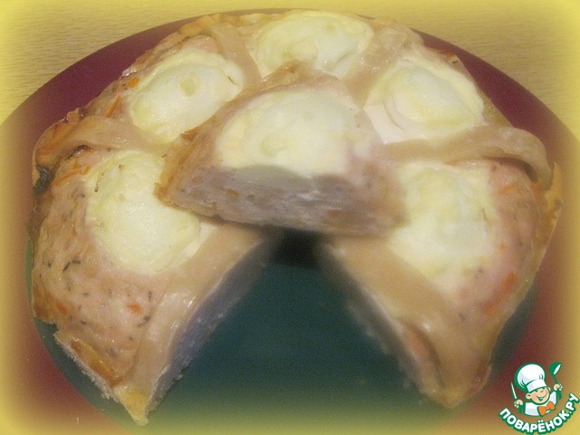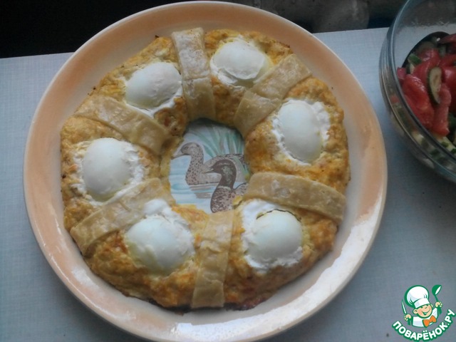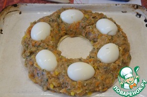 Сверху разложить половинки яиц срезом вниз, утопив их в фарше. Тесто внутри кольца вырезать.