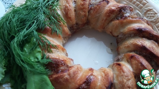Противень смазать растительным маслом, уложить на него кружок из теста и выложить на него фарш в форме кольца.