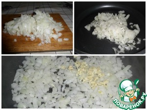 Мелко нарезаем лук. Обжариваем на масле. Добавляем мелко нарезанный чеснок.