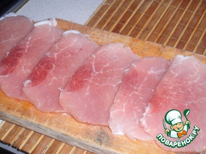 Мясо вымыть, каждую отбивную разрезать пополам. Отбивать.