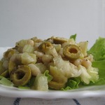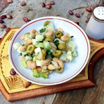 Итак, для салата берем 200 гр. отварной фасоли. Картофель нужно заранее отварить в мундире, очистить и нарезать небольшими кубиками.