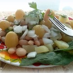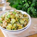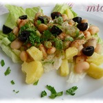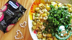 Заправляем салат растительным маслом или майонезом - по вкусу! У меня ушло около 4-5 ст. л. оливкового масла, т. к. картофель и фасоль его быстро впитывают. Можно совсем немного (!) посолить и поперчить, не забывайте, что в салате есть оливки.