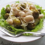 Сельдерей нарезаем кубиками, оливки и зеленый лук (только белую его часть) - кольцами. Можно взять обычный репчатый лук. Его нужно нарезать кубиками и замочить на 15-20 мин. в кипятке, чтобы отдал горечь. Затем обдать холодной водой и использовать для салата.