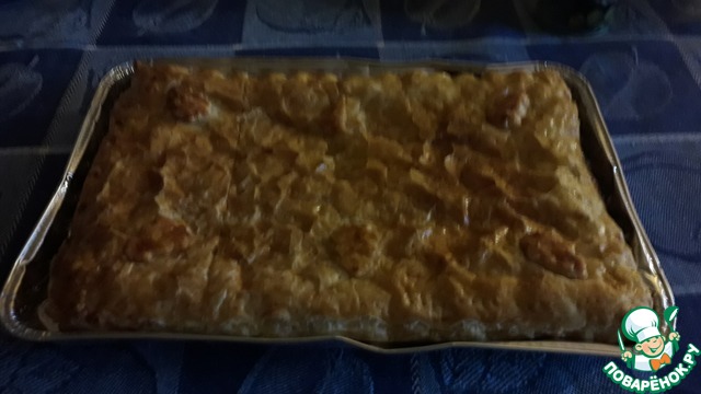 Форму 26 см смазать сливочным маслом. Готовое слоеное тесто разделить на два круга. Первый круг теста уложить на дно формы и проколоть вилкой. Второй круг проколоть на доске. -