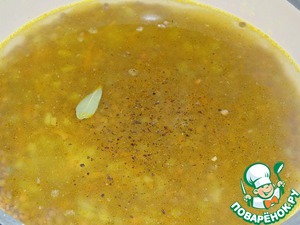Залить всё водой (у меня ушло 4 стакана). Посолить, поперчить, добавить карри и маленький лавровый листок. Закрыть крышкой и готовить на медленном огне 30-40 минут.