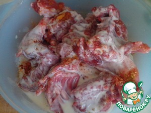 Тушку нутрии промыть, обсушить и разделать на порционные куски. Я обычно мякоть срезаю на котлеты, а из остального делаю это блюдо. Вы можете мякоть оставить на кости. Мясо посолить, поперчить. Добавить половину паприки, перемешать. Залить кефиром и оставить мариноваться на пол часа. Затем мясо вместе с маринадом переложить в огнеупорную форму. Форму лучше взять побольше, сока из овощей будет много Что бы не вытекал.