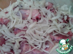 Лук порезать полукольцами, замариновать. Маринад: 50 гр воды+ уксус+ соль+растительное масло. Оставить на 5 минут. Затем маринад слить, а лук выложить на нутрию.