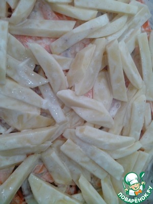 Картофель очистить, промыть и порезать брусочками. Перемешать с майонезом и солью. Можно использовать сметану, я люблю, когда картофель в майонезе. Выложить на лук.
