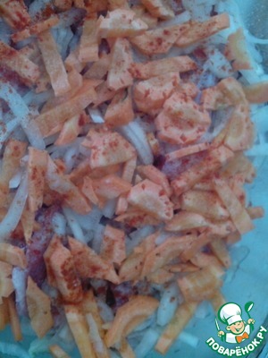 Морковь очистить промыть. Нарезать на брусочки, посолить и перемешать с оставшейся паприкой и половиной сметаной. Выложить на картофель.