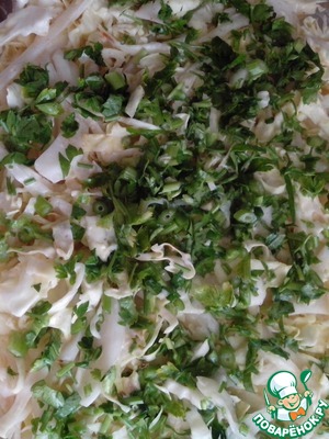 Капусту нашинковать, посолить и перемешать с оставшееся сметаной. Выложить на морковь, а сверху порезать зелень.