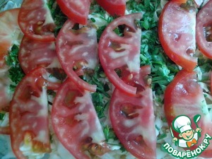 Помидор промыть, порезать на тонкие пластины, выложить поверх зелени.