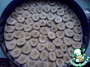 У меня были маленькие бананы, поэтому 3, думаю хватит и 2 больших. Нарезаем кружками. К тому времени как я дорезала бананы масса уже схватилась, и довольно нормально застыла. Поэтому поверх нее я выложила бананы. Если Ваши бананы начнут немного тонуть, не расстраивайтесь. Убрать в холодильник.