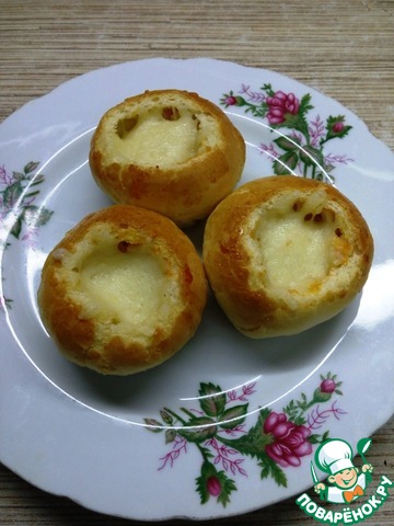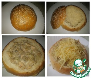 Мы вышли на финишную прямую!!! В принципе наш "Не жюльен" готов, но вот что я делала дальше... Берем булочку (у меня собственного приготовления), делаем ей "секир башка" и потрошим внутренность))) в полость укладываем "Не жюльен", присыпаем тертым сыром, а дальше...