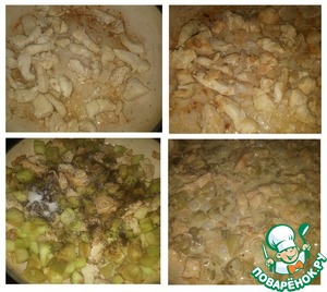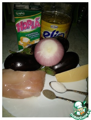 На сковороду добавляем подсолнечное масло, разогреваем и начинаем готовить "Не жюльен"... А именно... закидываем курочку и минуты 3 обжариваем на сильном огне (нам не нужен румянец). К курице добавляем лук и жарим тоже быстро пока он не станет прозрачным. Следующими добавляем баклажаны и не перемешивая накрываем крышкой на 1-2 минут, чтоб они пустили сок. А теперь добавляем соль, перец, сливки перемешиваем все, убавляем огонь на минимум, накрываем крышкой и томим наше блюдо минут 15.