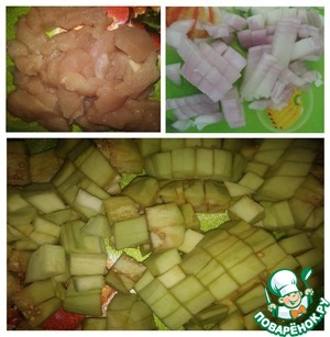 Все режем мелким кубиком. Баклажаны я не вымачивала и не держала в соли, а просто промыла несколько раз, чтобы семечки удалить.