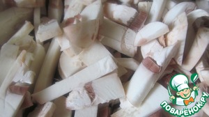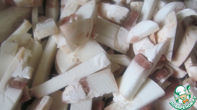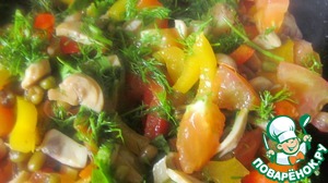 3. Красный и желтый болгарский перец порезать, добавить на сковороду к грибам. Помидор обдать кипятком, снять шкурку, нарезать кубиками и добавить к перцу.