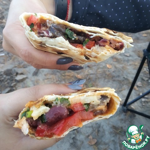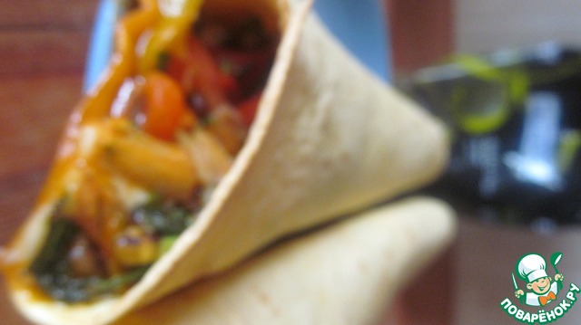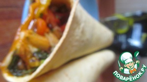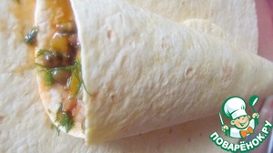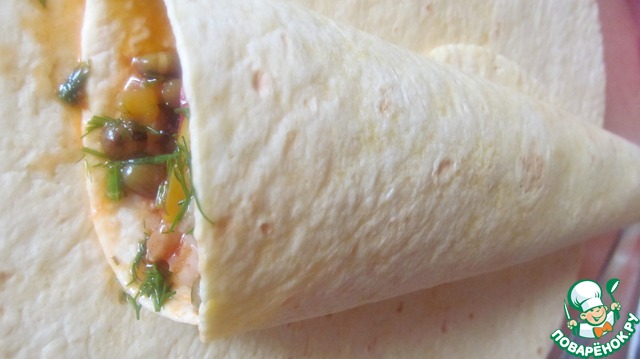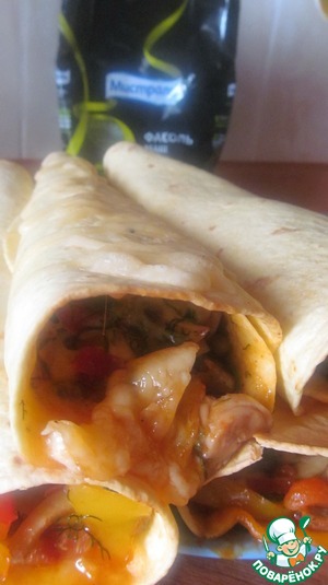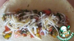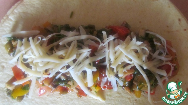 6. На готовые тортилья выложить начинку, сверху посыпать тертым сыром, свернуть