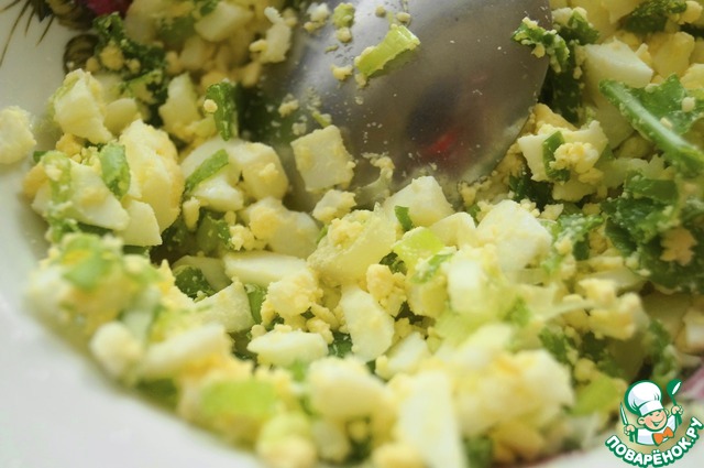 Для начинки: Отварные яйца мелко нарезать и поместить их в чашу, добавить к ним мелко нарезанный зеленый лук, посолить и перемешать