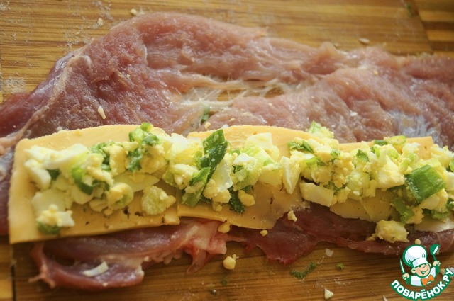 На одну отбивную выложить полоску сыра, а поверх яичную начинку.
