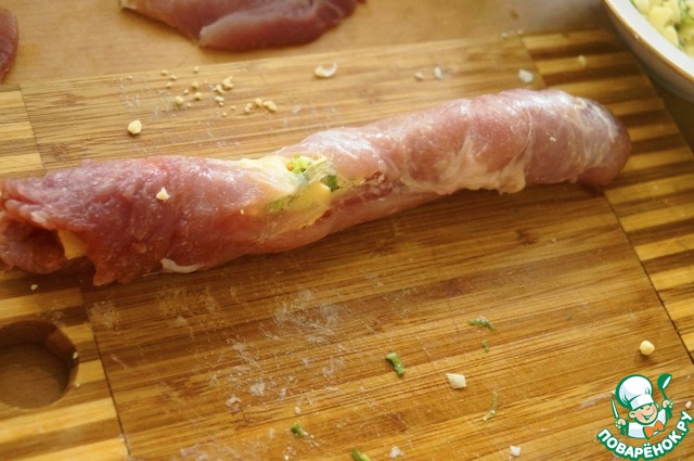 Фламенкины - своего рода рулет из свиной отбивной начиненный чаще всего хамоном и обваленные в панировочных сухарях, которые затем обжаривают в кипящем масле. Подают чаще всего с картофелем фри и майонезом. Я решила поэксперементировать с начинкой и это получилось очень вкусно и сытно. Помните раньше часто бабушки и мамы делали пирожки с начинкой из яйца и лука? Это было вкусно и я решила, что такая начинка не сможет испортить и такое отличное мясо закрученное в виде рулета.