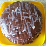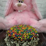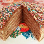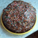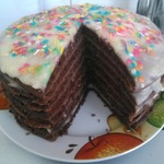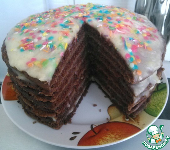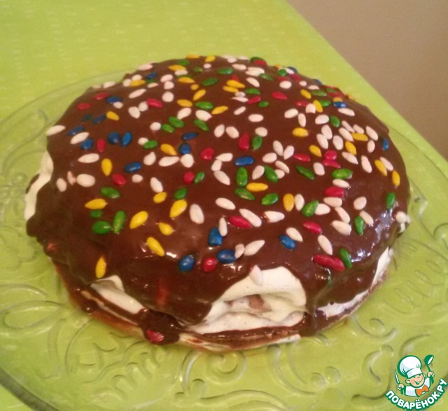 Я сверху обмазала торт шоколадной глазурью и посыпала кондитерской посыпкой.