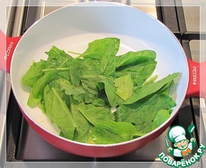 • Положить промытые листья шпината и потомить около 2-х минут. Посолить. Выложить готовые листья шпината на тарелку
