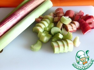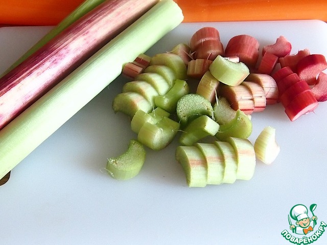 • Складываем кусочки ревеня в кастрюлю, добавляем сначала две ложки сахара и тушим до образования однородной массы, добавляем сахар по вкусу, у меня всего ушло примерно 5 столовых ложек. Выключаем огонь и всыпаем в ревенекую "кашу" горсть мелко порубленных орехов. В случае, если начинка все еще будет жидковата, то добавьте еще орехов или загустите ее ложкой панировочных сухарей или толченого печенья, или половиной пачки ванильного пудинга. Можно просто добавить ложку крахмала. Начинку остудить.