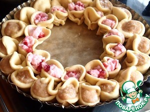 • Укладывать наши "пельмешки" (или розочки, как кому больше нравится) по кругу, не очень плотно.