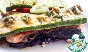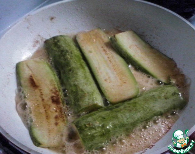 Точно как и рыбу, обжариваем баклажаны и кабачки с обеих сторон до золотистой корочки. Кабачки перед жаркой лучше присолить, что бы кожура не горчила.