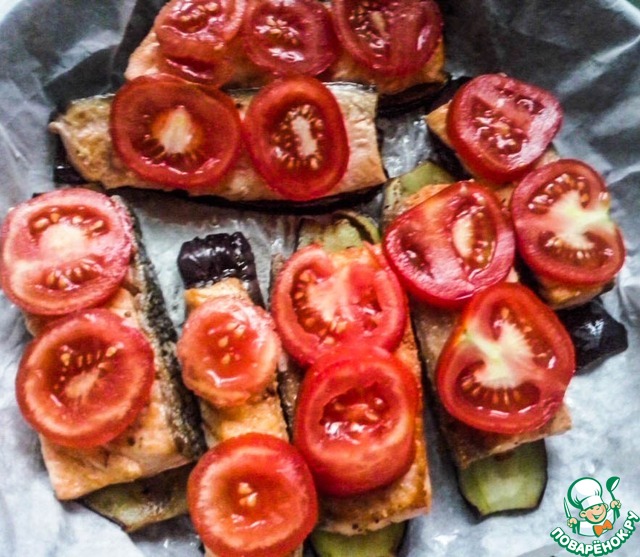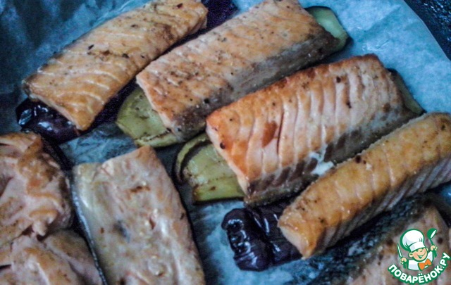 Разогреваем духовку до 180 градусов. Форму застилаем плотным пергаментом или фольгой. Укладываем слоями. Не принципиально что будет снизу, у меня снизу были баклажаны. И так, кладем баклажан, сверху аккуратно выкладываем рыбу.